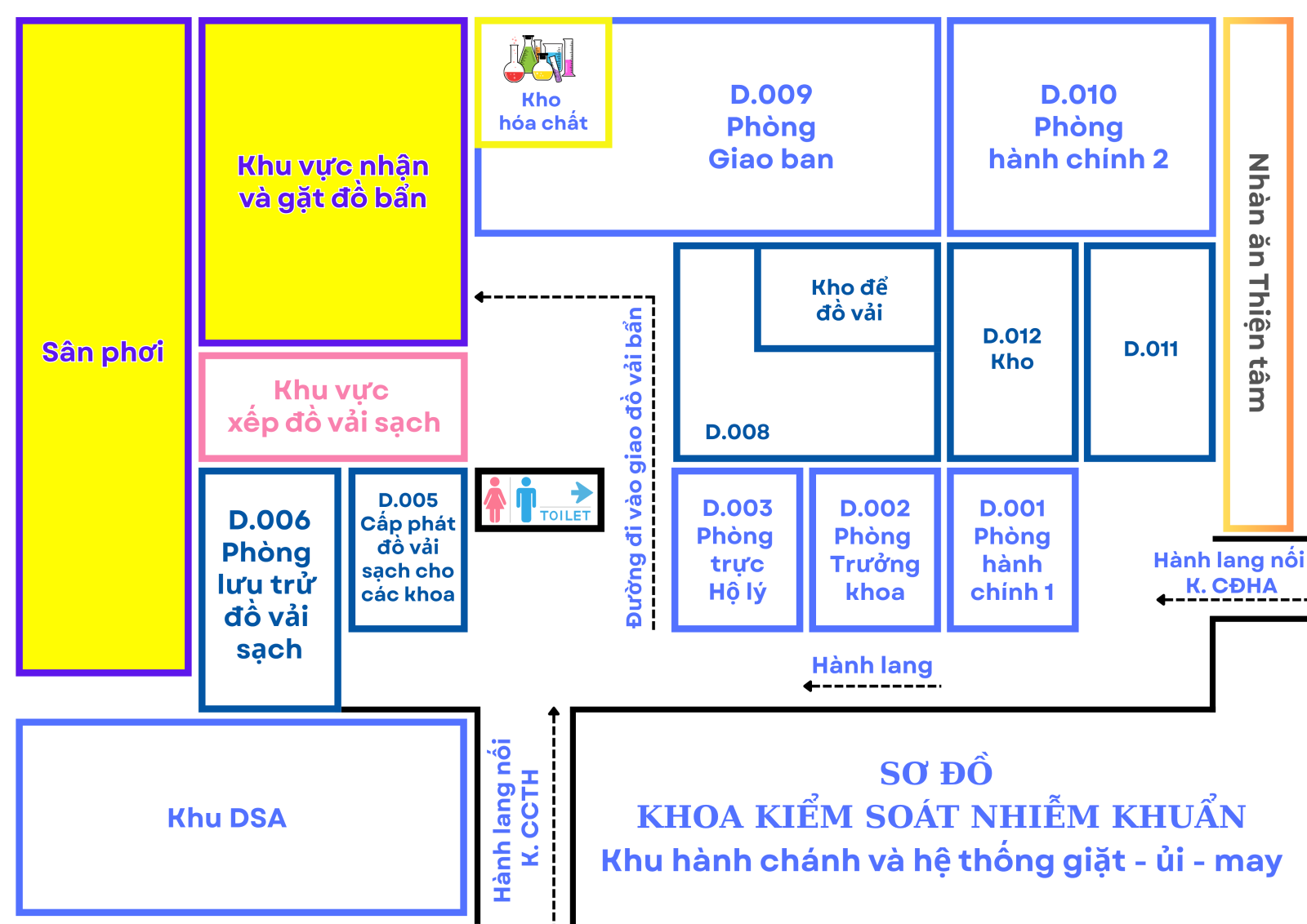 3.Tổ giặt là: Nhà giặt thiết kế một chiều từ khu nhiễm đến khu sạch, đủ các trang thiết bị và phương tiện để giặt là.