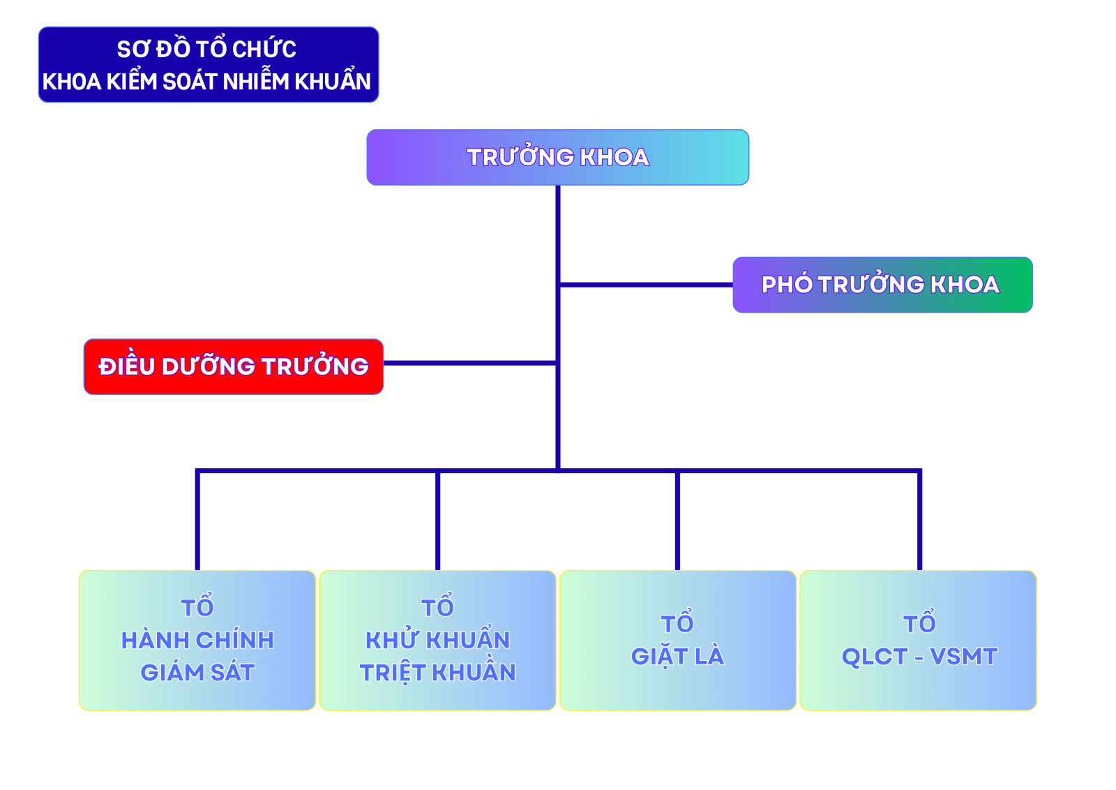 – Khoa kiểm soát nhiễm khuẩn có các bộ phận sau: Tổ Hành chính-giám sát; tổ Khử khuẩn-tiệt khuẩn; tổ Giặt là-may vá và tổ Vệ sinh môi trường-quản lý chất thải.