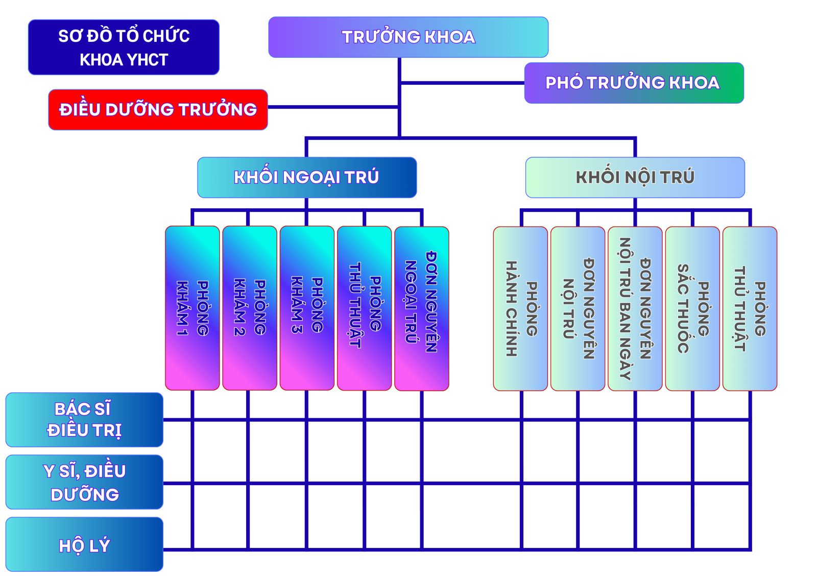 - Tham mưu cho Giám đốc Bệnh viện trong công tác chỉ đạo, phát triển mạng lưới YHCT, triển khai mô hình kết hợp Đông - Tây y trong chăm sóc sức khỏe nhân dân.